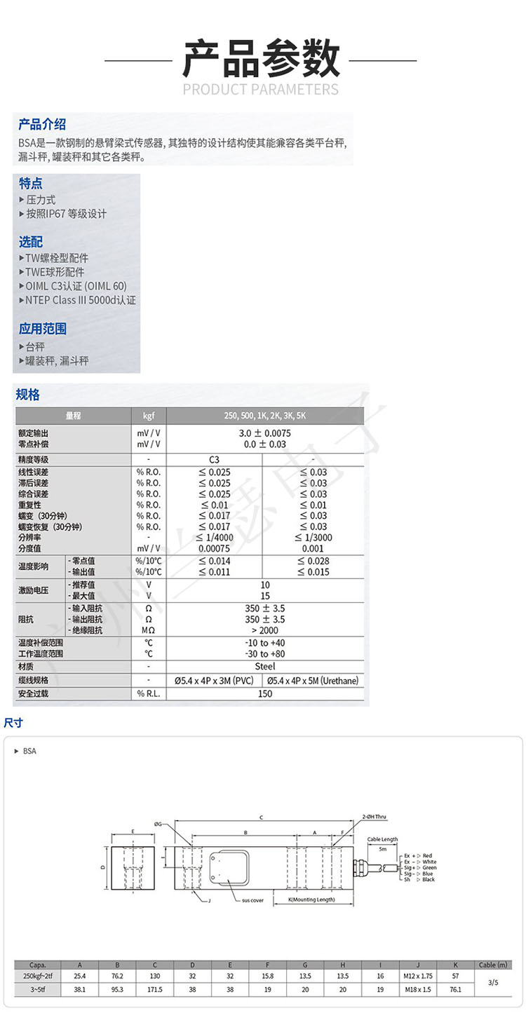 韓國(guó)凱士CAS BSA-1T稱重傳感器參數(shù)
