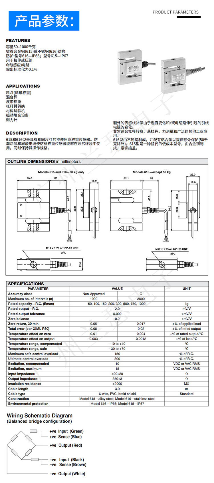 美國Tedea 615-100kg稱重傳感器產(chǎn)品參數(shù):
