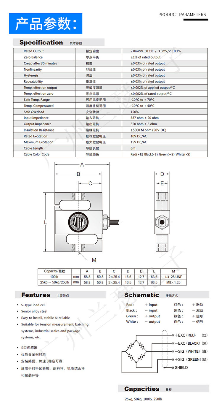 美國(guó)傳力BSA-250LB稱重傳感器技術(shù)參數(shù):