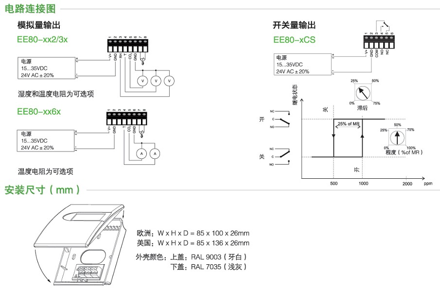 儀表外形設(shè)計(jì)美觀、安裝簡(jiǎn)便,CO2輸出信號(hào)為標(biāo)準(zhǔn)的4-20mA或0-5/10V DC信號(hào)。根據(jù)用戶的需求,EE80 還可輸出相對(duì)濕度和溫度信號(hào),并提供可設(shè)定報(bào)警點(diǎn)和回差點(diǎn)的開關(guān)信號(hào)輸出方式。多種的型號(hào)能滿足用戶的不同要求,所有EE80 系列變送器都可以配置清晰的液晶顯示模塊用以現(xiàn)場(chǎng)的參數(shù)顯示。