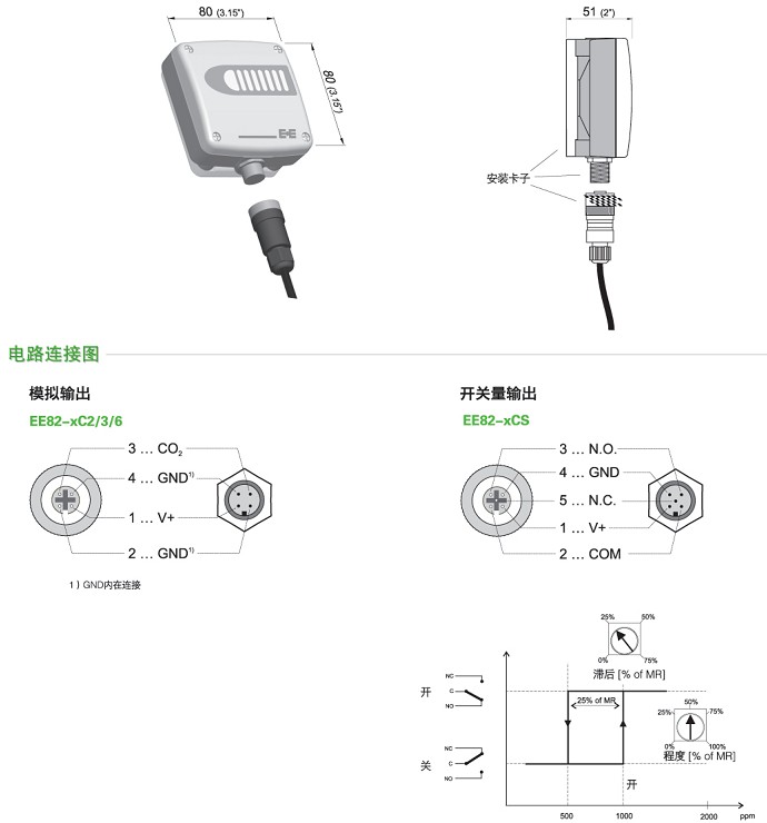 EE82測量范圍為 0...2000 / 5000 / 10000ppm,可選擇0-5/10V或4-20mA的模擬信號輸出,也可以選擇帶有報警設(shè)定點和回差設(shè)定點的開關(guān)信號輸出。使用卡座式安裝法蘭和信號連接插頭,無須打開外殼,就可以方便安裝變送器。